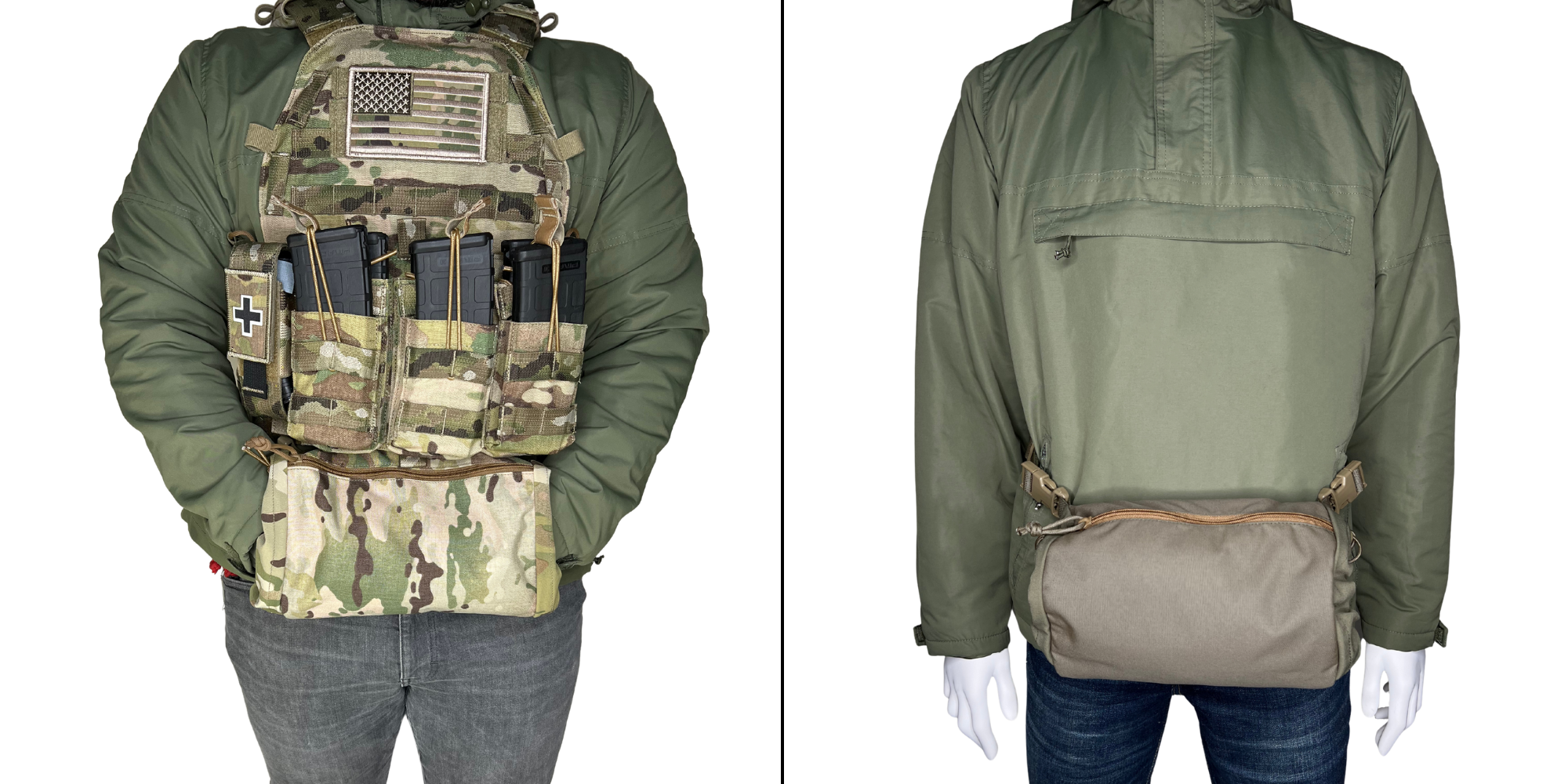 Use the waistband for around the waist attachment or apply the integrated dangler to a plate carrier or compatible chest rigs with hook and loop velcro. When using the dangler application, if desired, remove the slotted Female End Quick Release Buckles to remove unneeded extra material.