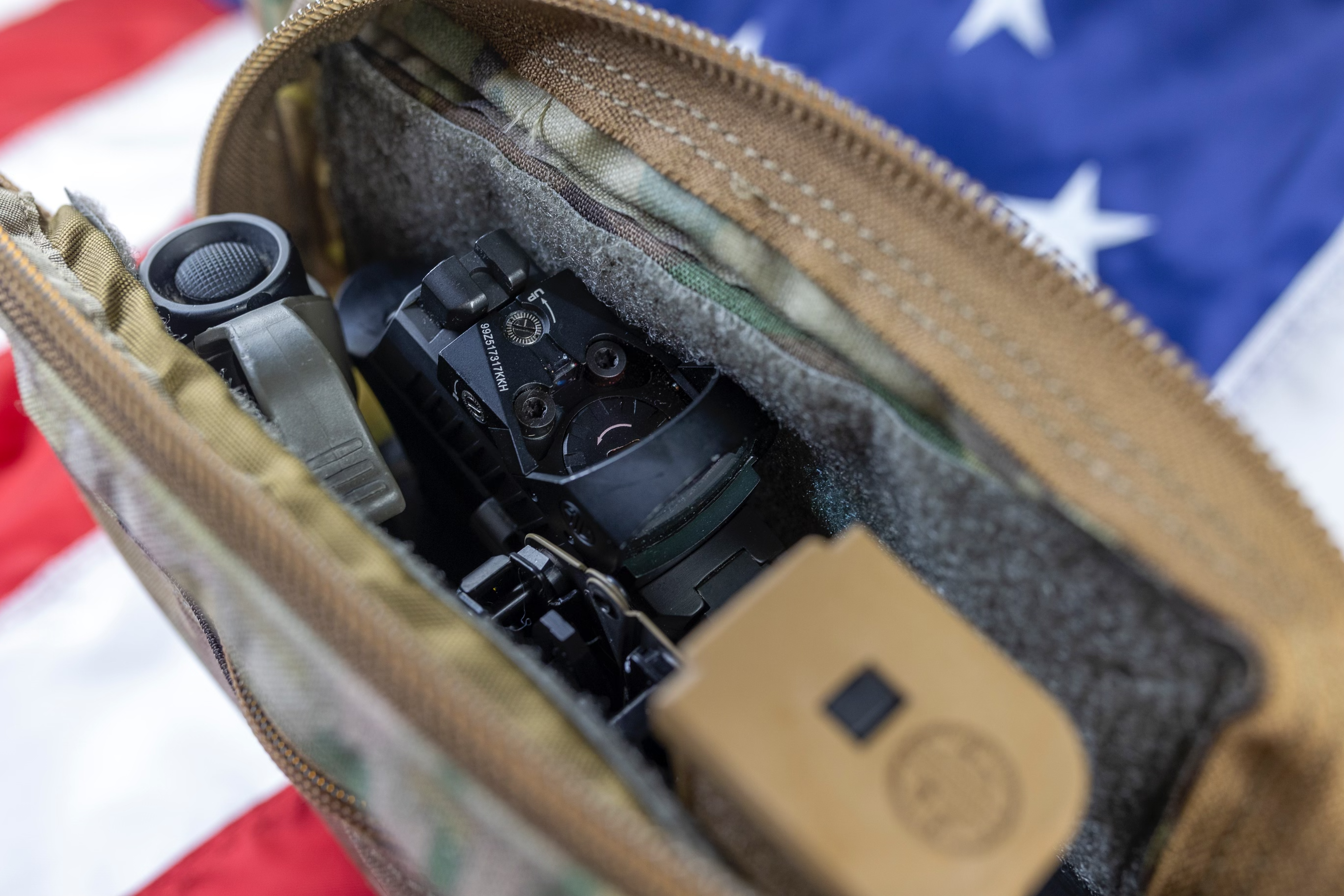 Perfect for summer carry. Main pocket fits Glock 19x with rmr great. Paired with Tight Chutes MARS low pro carry insert. Can fit zyn can, wallet, keys, and phone as well.